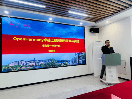 在随后的主题报告环节,经理满君丰作了《OpenHarmony卓越工程师培养探索与实践》的报告。他首先介绍了伟德国际唯一官网入口推进工科改革、培养卓越工程师,注重引育并举、建强团队队伍,深化产教融合、推进协同育人,建设实验实训中心、提供一流实训环境等四大举措;然后介绍了与拓维信息、开鸿智谷深度合作,联合开设“润之”卓越工程师班(鸿蒙班)的情况,并介绍了鸿蒙班采取双导师制、动态管理、精英模式培养等做法。