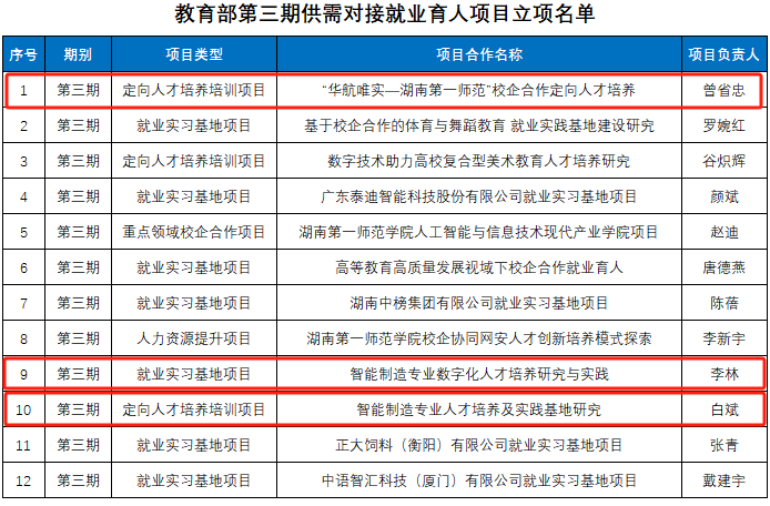近日,教育部高校员工司公布了第三期供需对接就业育人项目立项名单。公司共有3个项目被批准立项,分别为:曾省忠主持的定向人才培养培训项目“‘华航唯实——湖南第一师范’校企合作定向人才培养”、白斌主持的定向人才培养培训项目“智能制造专业人才培养及实践基地研究”、李林主持的就业实习基地项目“智能制造专业数字化人才培养研究与实践”。